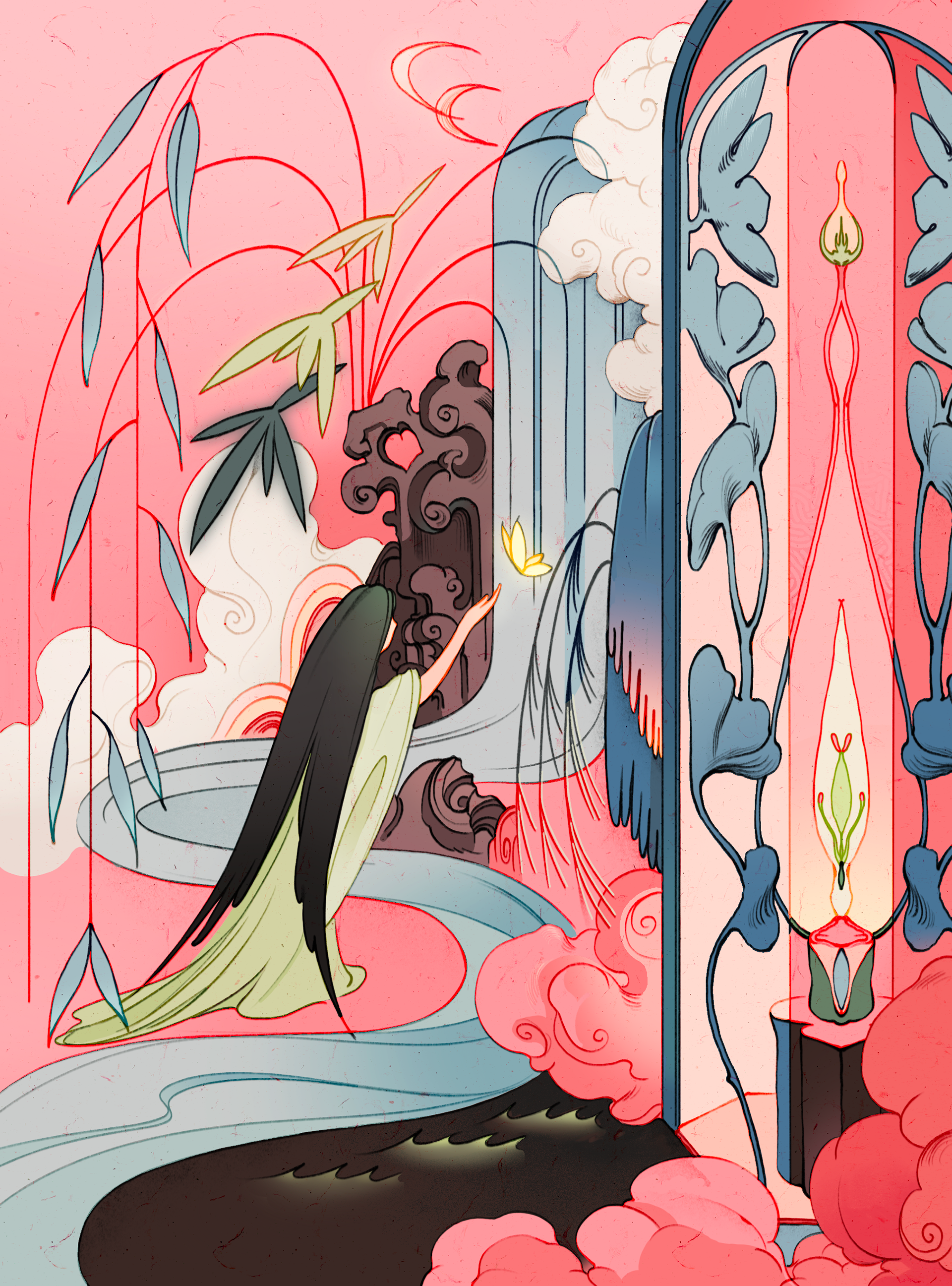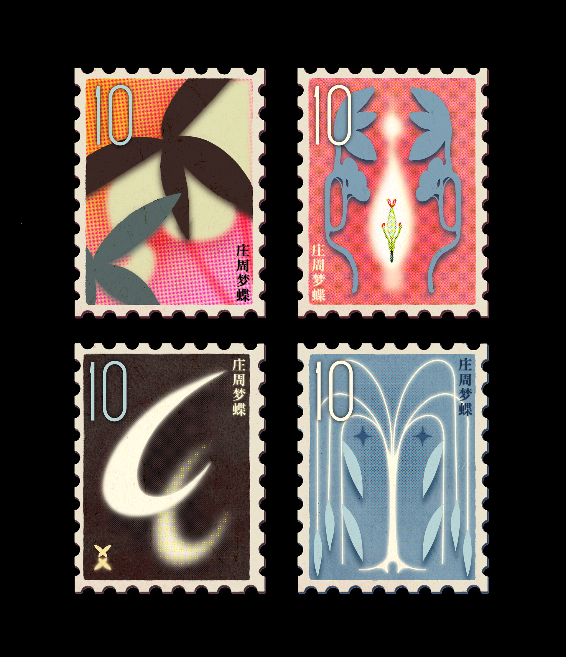 This project was created based on the Chinese classic “Zhuang Zhou Dreaming Butterfly”. Inspired by the visual language of ancient Chinese painting, I designed a set of stamps and an illustration being mocked-up on notebooks and T-shirts.
